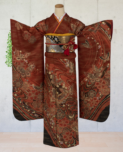 【赤錆色(あかさびいろ)】大小蝶が艶やかに舞うカッコイイ印象のお着物
