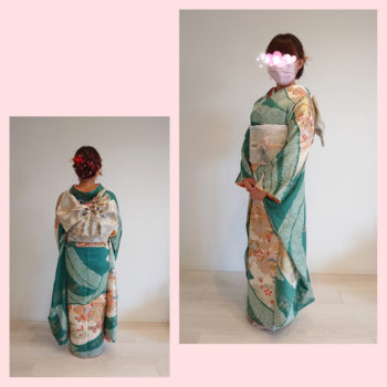 こちらのお客様、左側のお着物は三栗矢でレンタルいただいたもので