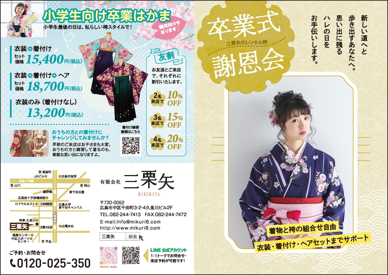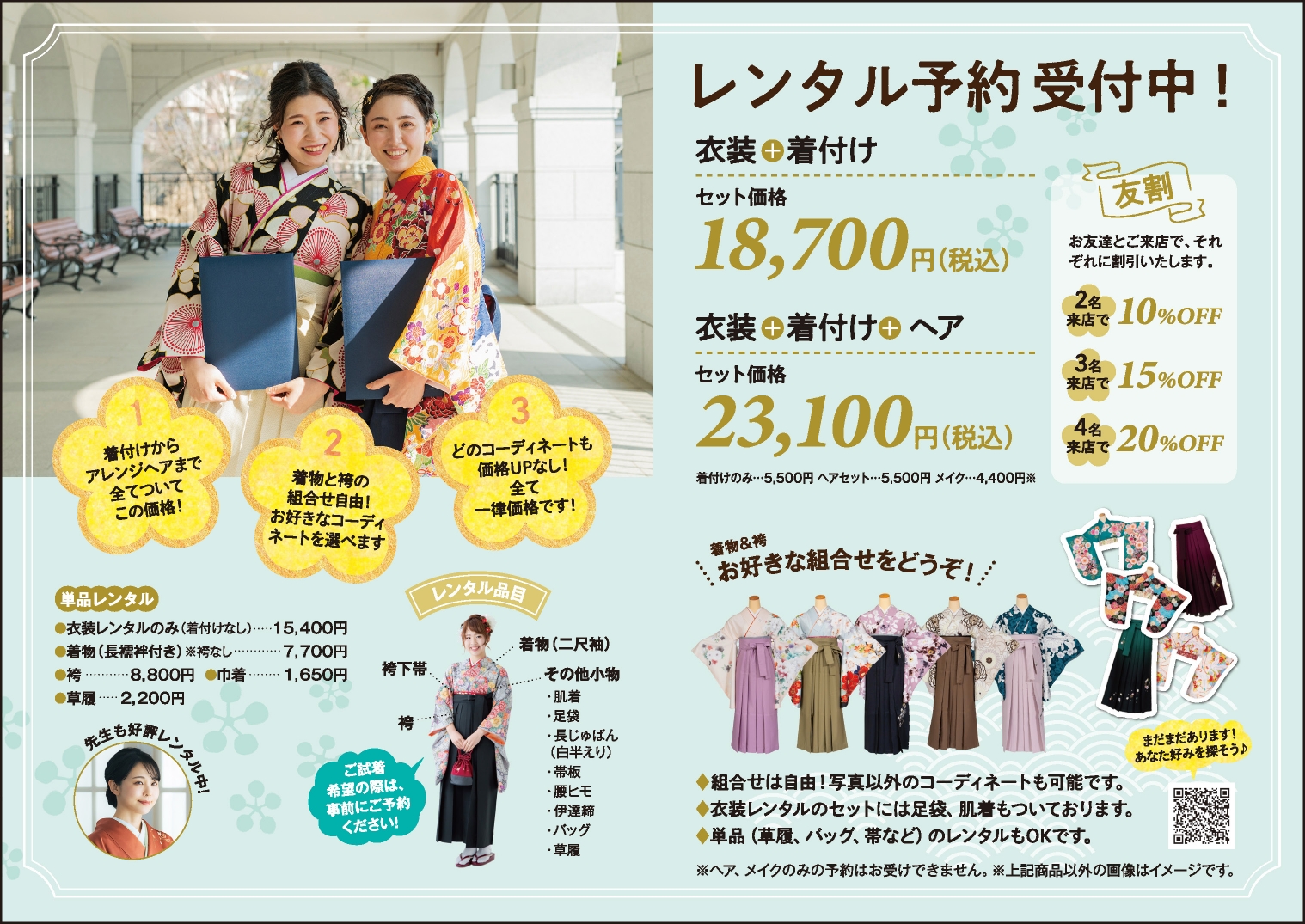 三栗矢では、【着付け】【アレンジヘア】【メイク】【備品レンタル】までトータルコーディネートが可能です!