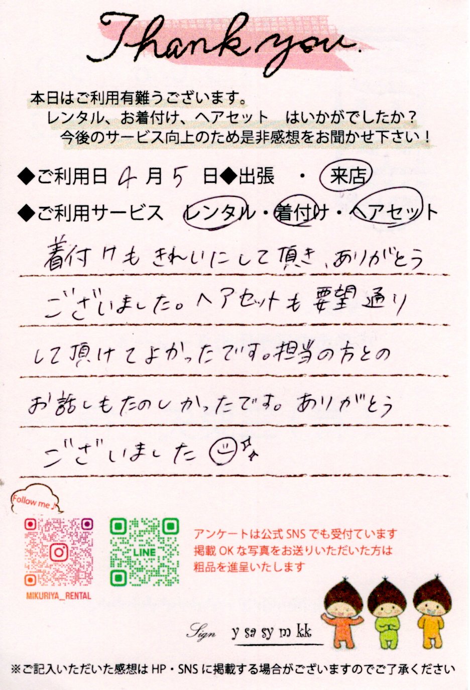着付けもきれいにして頂き、ありがとうございました ヘアセットも要望通りしていただけてよかったです 担当の方とのお話もたのしかったです ありがとうございました(^^♪